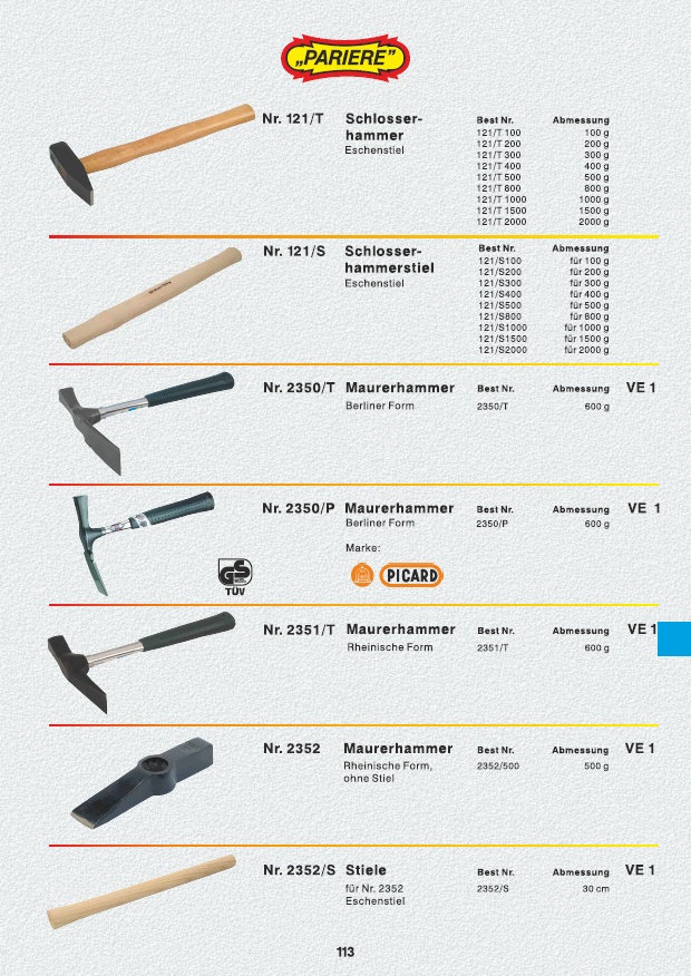Schlosserhammer, Schlosserhammerstiel, Maurerhammer, Stiele, Latthammer, Gipserbeil, Fäustel, Stiele, Gummiaufsätze, Plastikausbeulhammer, Holzhammer, Gummihammer, Vorschlaghammer, Stiele, Plattenlegerhammer, Gummiaufsatz, Pflasterhammer,