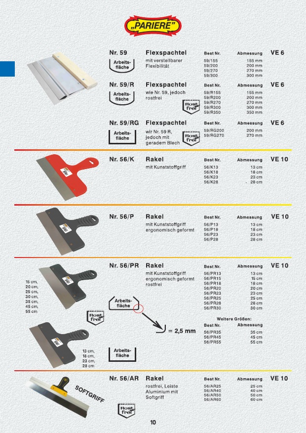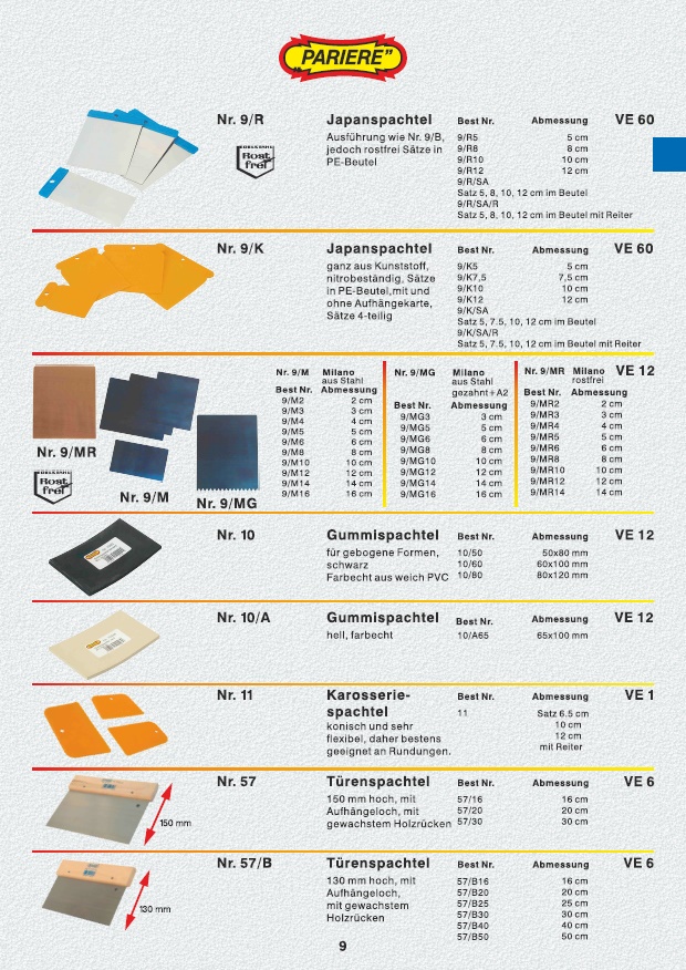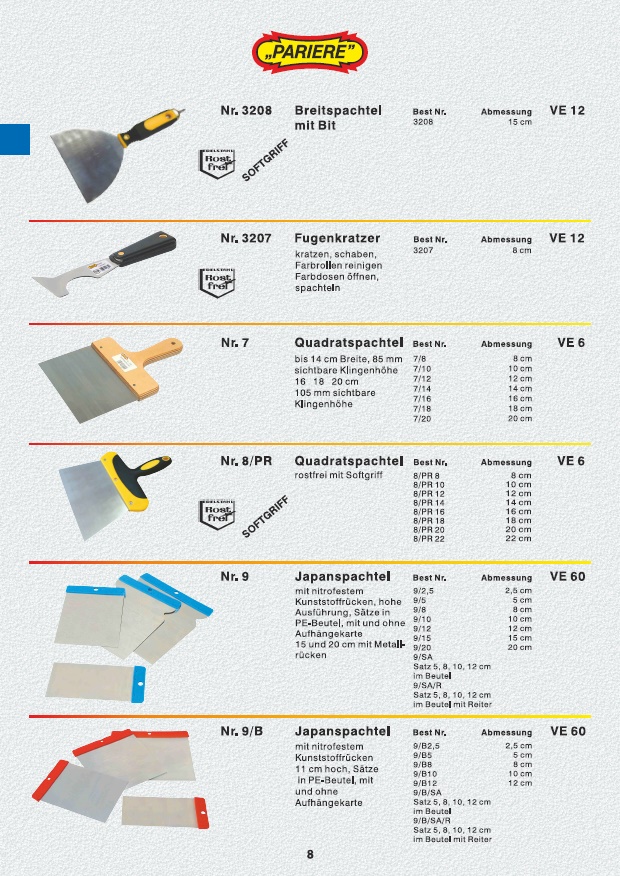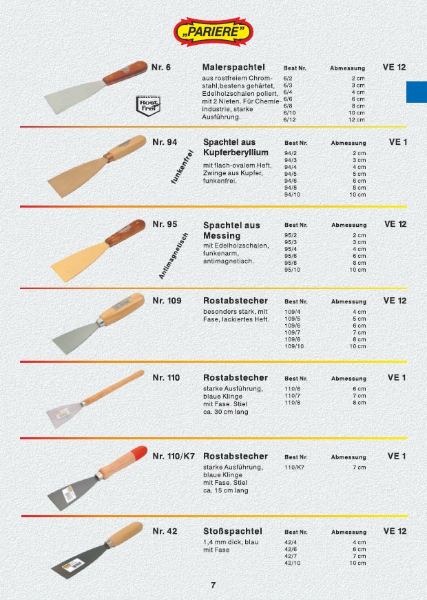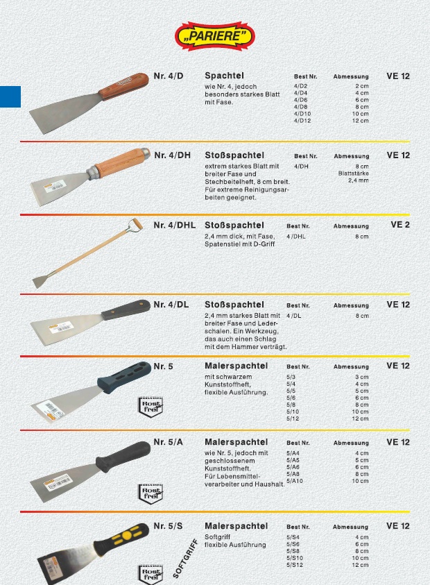Malerspachtel, Spachtel, Stoßspachtel, Spachtel aus Kupferberyllium, Spachtel aus Messing, Rostabstecher, Breitspachtel, Fugenkratzer, Quadratspachtel, Japanspachtel, Gummispachtel, Karosseriespachtel, Türenspachtel, Flexspachtel, Rakel, Rakel gezahnt, Tapetenabreißer, Stielhalter, Gerätestiel,