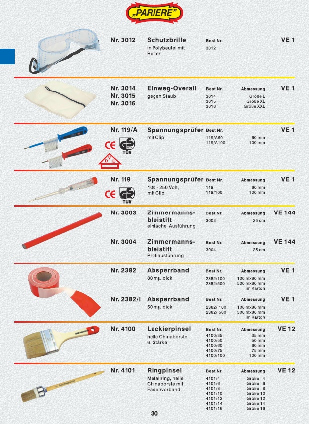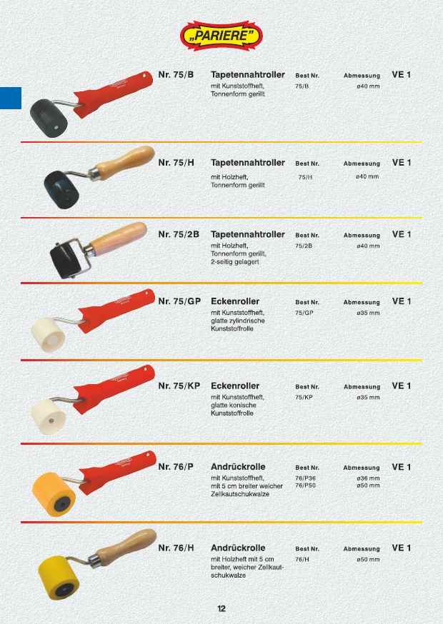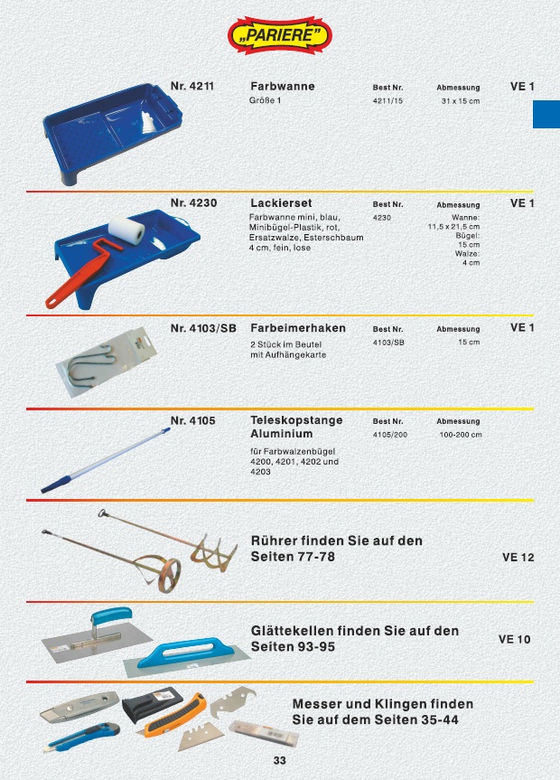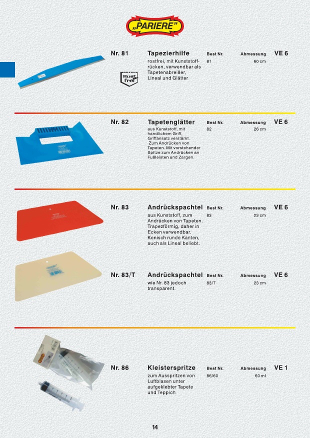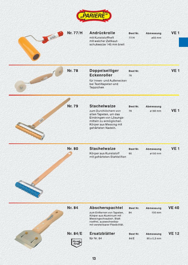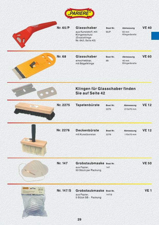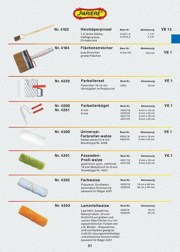 Glasschaber, Tapetenbürste, Deckenbürste, Grobstaubmaske, Schutzbrille, Einwegoverall, Spannungsprüfer, Zimmermannsbleistift, Absperrband, Lackierpinsel, Ringpinsel, Heizkörperpinsel, Flächenstreicher, Farbrollerset, Farbrollerbügel, Universal-Farbrollerwalze, Fassaden-Profiwalze, Farbwalze, Lammfellwalze, Abstreifgitter, Profi-Abstreifgitter, Heizkörperbügel, Heizkörperwalze, Farbwanne, Lackierset, Farbeimerhaken, Teleskopstange Aluminium