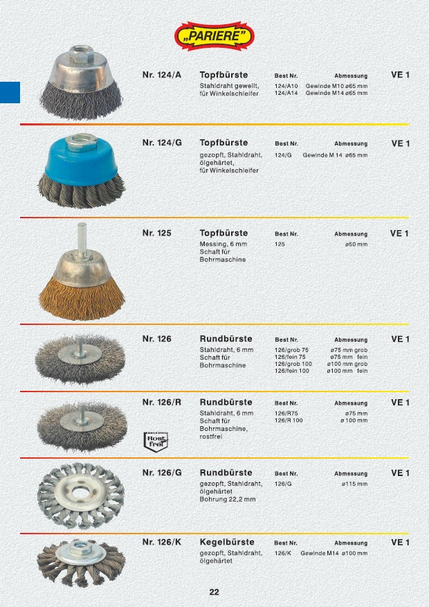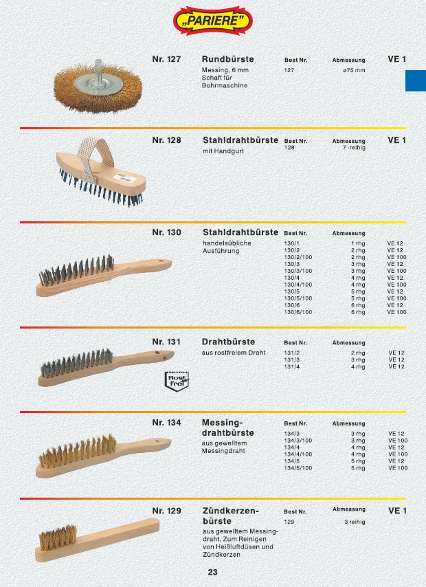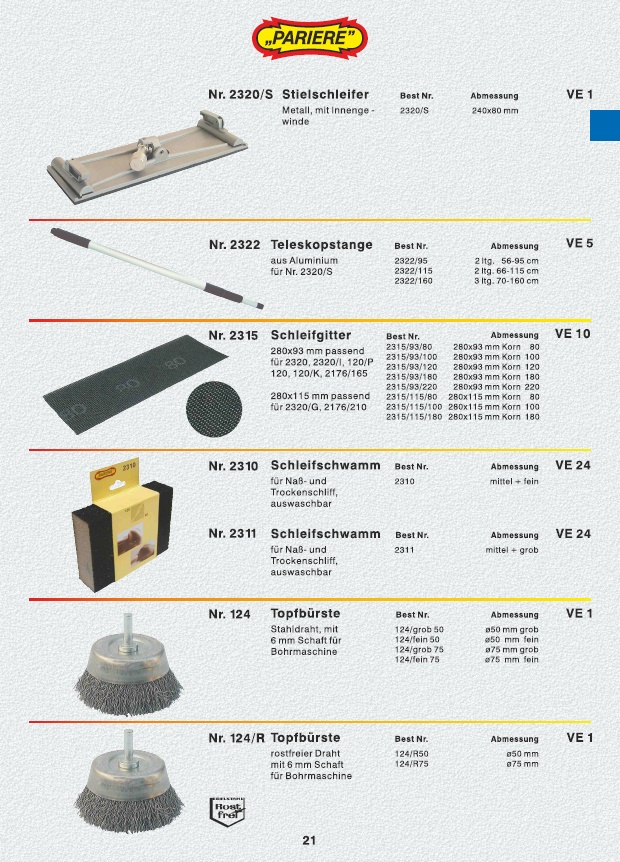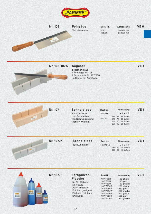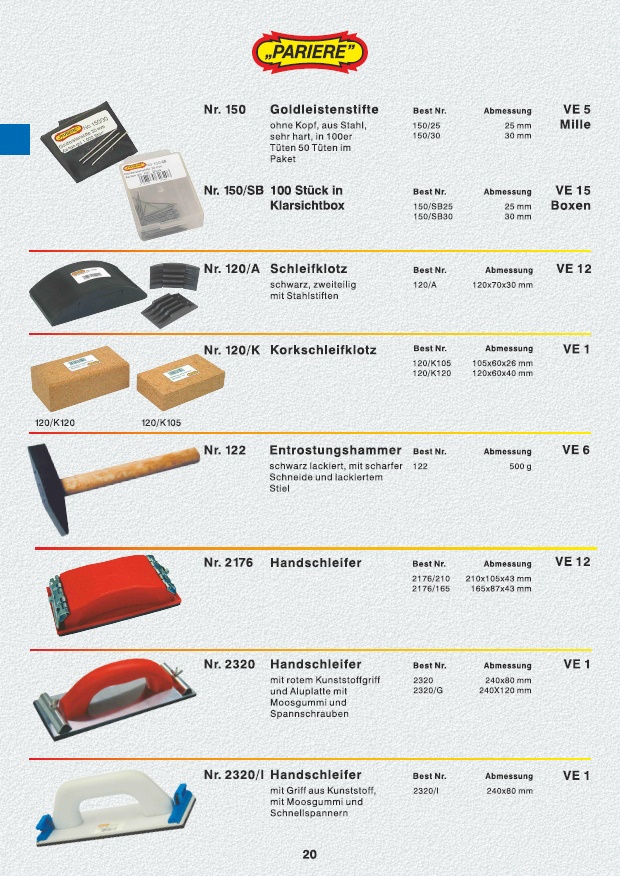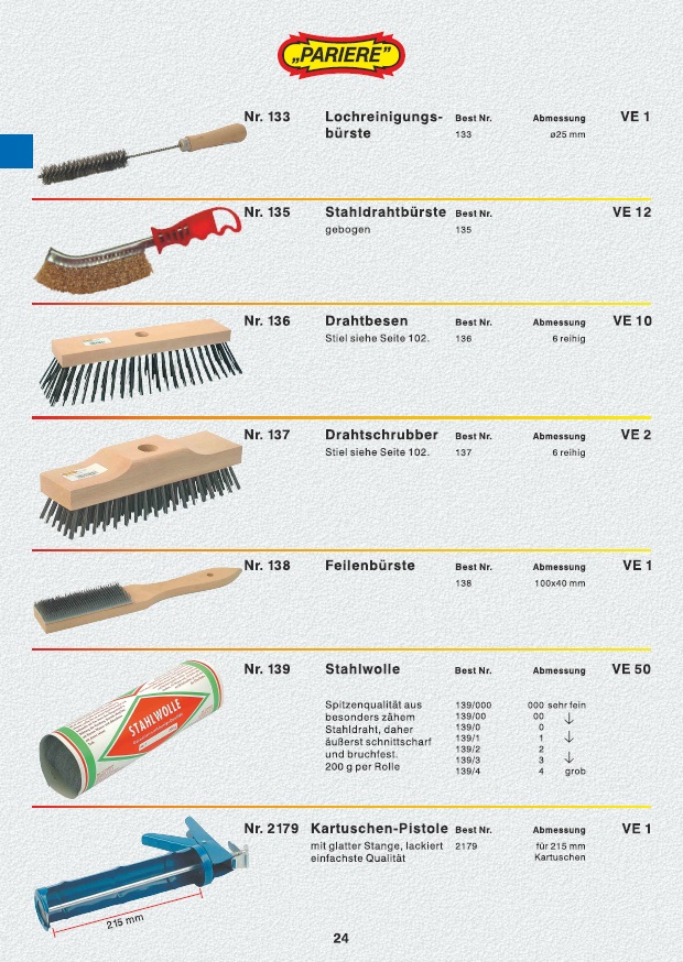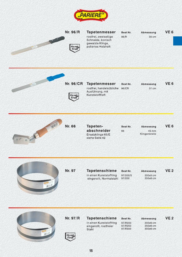 Glasschaber, Tapetenbürste, Deckenbürste, Grobstaubmaske, Schutzbrille, Einwegoverall, Spannungsprüfer, Zimmermannsbleistift, Absperrband, Lackierpinsel, Ringpinsel, Heizkörperpinsel, Flächenstreicher, Farbrollerset, Farbrollerbügel, Universal-Farbrollerwalze, Fassaden-Profiwalze, Farbwalze, Lammfellwalze, Abstreifgitter, Profi-Abstreifgitter, Heizkörperbügel, Heizkörperwalze, Farbwanne, Lackierset, Farbeimerhaken, Teleskopstange Aluminium