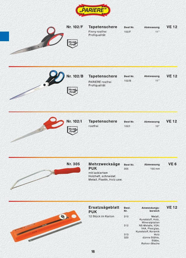 Tapetennahtroller, Eckenroller, Andrückrolle Doppelseitiger Eckenroller, Stachelwalze, Abscherspachtel, Ersatzblätter für Abscherspachtel, Tapezierhilfe, Der starke Helfer, Tapetenglätter, Andrückspachtel, Kleisterspritze, Tapetenmesser, Tapetenabschneider, Tapetenschiene,Tapetenschere, Mehrzwecksäge PUK, Ersatzsägeblätter für PUK, Feinsäge, Sägeset, Schneidlade, Alu-Schneidlade, Schnurroller, Schlagschnur, Farbpulverbeutel, Farbpulver Flasche, Senklot, Glasschaber, Tapetenbürste, Deckenbürste, Grobstaubmaske, Schutzbrille, Einwegoverall, Spannungsprüfer, Zimmermannsbleistift, Absperrband,