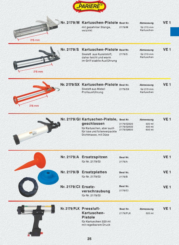 Kartuschen-Pistole, Kartuschen-Pistole geschlossen, Ersatzspitzen, Ersatzplatten, Ersatzverschraubung, Pressluft-Kartuschen-Pistole, 2-Komponenten Kartuschen-Pistole, Silicon-Fugenglätter, Silicon-Fugen-Set,