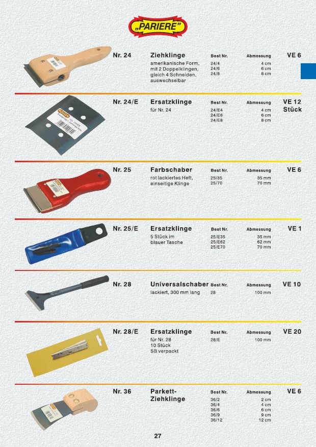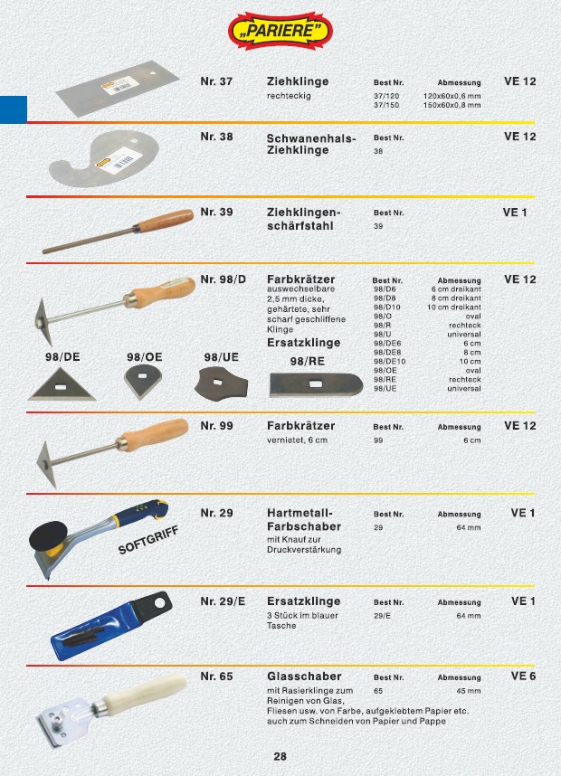 Ziehklinge, Ersatzklinge für Ziehklinge, Farbschaber, Ersatzklinge für Farbschaber, Universalschaber, Ersatzklinge für Universalschaber, Parkett-Ziehklinge, Ziehklinge, Schwanenhalsklinge, Ziehklingenschärfstahl, Farbkrätzer, Ersatzklinge für Farbkrätzer, Hartmetall-Farbschaber, Ersatzklinge für Hartmetallschaber, Glasschaber